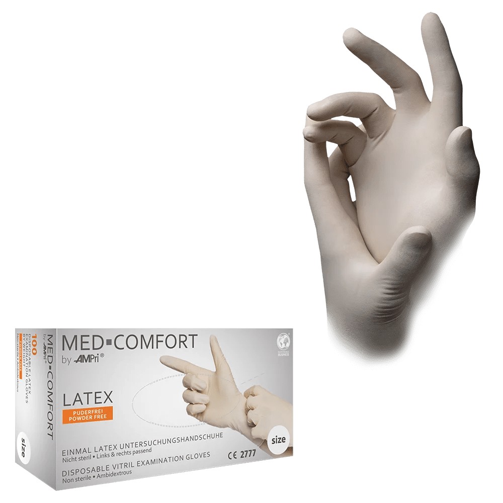 Med-Comfort Latex Einweghandschuhe verbinden natürliche Elastizität mit hohem Tragekomfort und zuverlässigem Schutz für anspruchsvolle Arbeitsbereiche. Ungepudert und doppelt chloriert für einfaches An- und Ausziehen, mit volltexturierter Oberfläche für hervorragenden Grip. Mittelstarke Materialstärke erhöht die Durchbruchfestigkeit bei gleichzeitig guter Tastwahrnehmung. Beidhändige Passform, unsteril, als Medizinprodukt Klasse I CE-gekennzeichnet und gemäß PSA in Kategorie III eingestuft. Erfüllt relevante Normen (EN 374-1/4/5, EN ISO 21420, EN 455-1–4) und besitzt AQL 1,5. Bietet biologischen Schutz gegen Viren, Bakterien und Pilze sowie Chemikalienschutz Typ B. Ideal einsetzbar in Klinik, Praxis, Dental, Lebensmittelverarbeitung, Industrie, körpernahen Dienstleistungen, Behörden und Bildung. Hinweis: Latex kann bei empfindlichen Personen Allergien auslösen; nicht geeignet für den Umgang mit Ölen und organischen Lösungsmitteln. Bei Fragen zur Eignung oder Chemikalienbeständigkeit beraten wir Sie gerne.